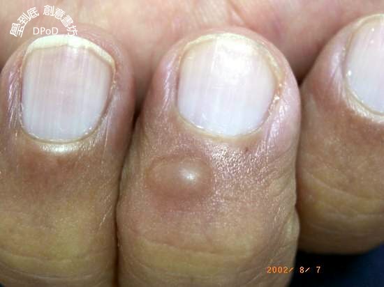 67歲男性主訴右手中指尾節長出一顆不痛不癢的軟性丘疹已有兩週..